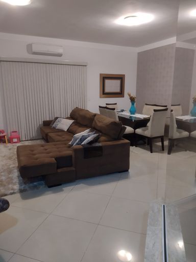 A casa conta com uma ampla sala de TV com pé direito duplo, integrada à sala de jantar e cozinha, proporcionando um ambiente espaçoso e moderno. O acabamento é de alto padrão, com piso porcelanato em toda a casa e teto rebaixado com gesso tabicado.